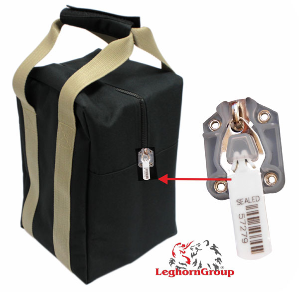 Geanta se închide cu sigilii de securitate numerotate secvențial și personalizate cu numele clientului. Sigiliile sunt produse direct de LeghornGroup, permițând detectarea imediată a oricărei tentative de manipulare.