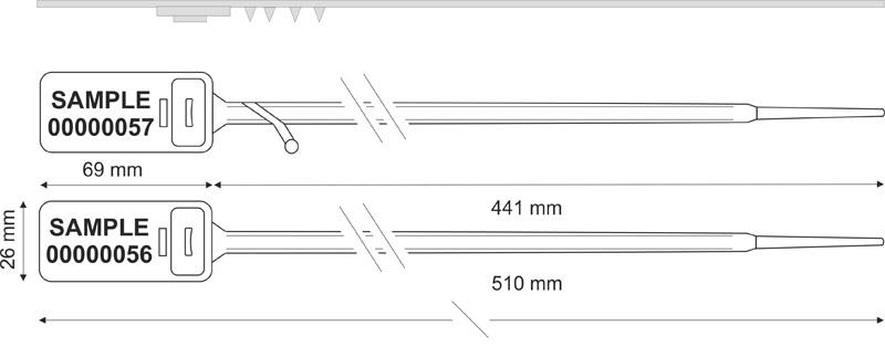 Sigiliu din plastic foarte robust. Este realizat cu insertie din metal si poate fi realizat si cu pre-taiere. Sigiliul este produs in benzi de cite 10 bucati cu serie numerica progresiva. Daca doriti un produs cu aceste caracteristici, dar cu o lungime mai mica va putem oferi versiunea mai lunga a acestui sigiliu Hectorseal LT: Hectorseal 7,5×430 mm cu lungimea de 430 mm. Acest sigiliu din plastic robust poate fi folosit in foarte multe cazuri: Poate fi folosit pentru a securiza orice tip de mijloc de transport sau poate fi folosit pentru a securiza saci cu dimensiuni mari. Pentru a avea o siguranta majora acest sigiliu trebuie inchis tragind cit mai mult posibil de coada astfel ca inchiderea sa fie lipita de obiectul care trebuie securizat. Coada care ramine trebuie taiata.