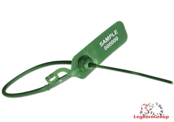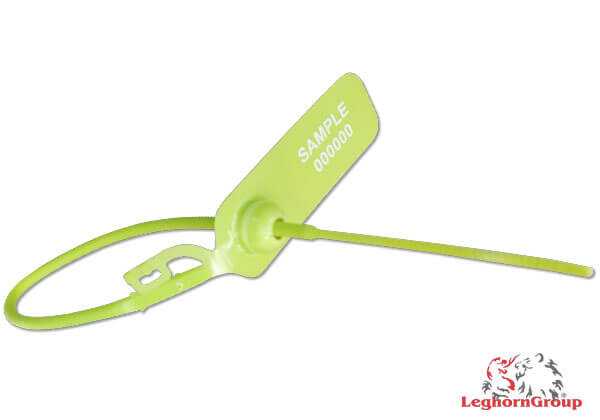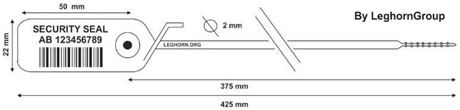 Sigiliu din plastic reglabil. Mecanizm de închidere cu blocaj metalic. Măsura etichetei: 22×50 mm.